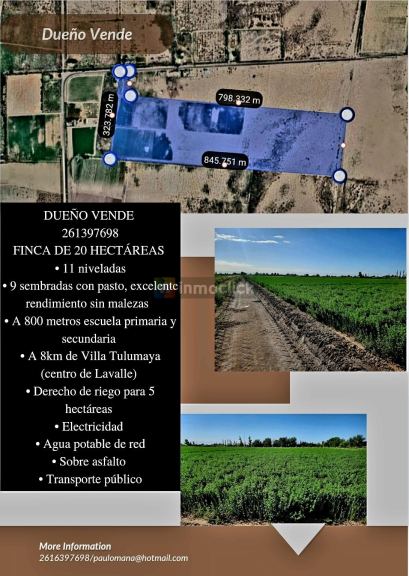 En la hermosSUSTRAIDO DE INMOCLICK.COM.ARa provincia de MTOMADO DE INMOCLICK.COM.ARendoza, específicaPUBLICACION DE INMOCLICK.COM.ARmente en LavalCONTENIDO PROPIEDAD DE INMOCLICK.COM.ARle, se encuentra ePUBLICACION DE INMOCLICK.COM.ARsta increíbleSUSTRAIDO DE INMOCLICK.COM.AR finca de 20 hecSUSTRAIDO DE INMOCLICK.COM.ARtáreas que ofrece unCOPIADO DE INMOCLICK.COM.ARa oportuniCONTENIDO PROPIEDAD DE INMOCLICK.COM.ARdad única. CoVEA ESTA PUBLICACION ACTUALIZADA EN INMOCLICK.COM.ARn 11 hectáreas nivSUSTRAIDO DE INMOCLICK.COM.AReladas y 9 seVEA ESTA PUBLICACION ACTUALIZADA EN INMOCLICK.COM.ARmbradas con pastoPUBLICACION DE INMOCLICK.COM.AR de excelente COPIADO DE INMOCLICK.COM.ARrendimiento, esteCONTENIDO PROPIEDAD DE INMOCLICK.COM.AR terreno es idealCONTENIDO PROPIEDAD DE INMOCLICK.COM.AR para actividadCONTENIDO DE INMOCLICK.COM.ARes agrícolas yCONTENIDO PROPIEDAD DE INMOCLICK.COM.AR ganaderas.